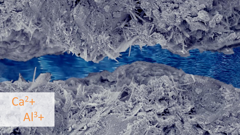 継続的な化学反応により不溶性のセメント結晶が生成され、不溶性のセメント結晶は、細孔、空隙、ひび割れを埋め尽くします。
